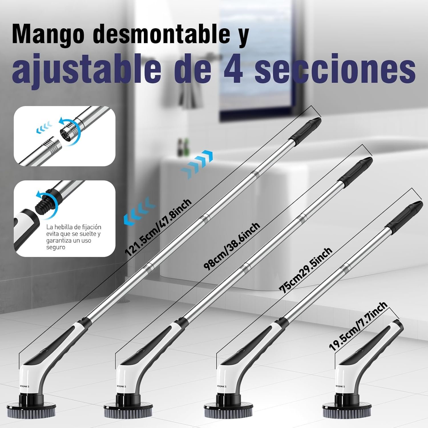 【Asa desmontable y ajustable de 4 secciones】El cepillo de limpieza eléctrico con mango desmontable y ajustable de 4 secciones. El mango ajustable de acero inoxidable se puede extender a120cm. Usted no tiene que subir a la parte superior de los mostradores, sillas o escaleras de mano para llegar por encima de los armarios o puertas. Con una potencia de torsión 25 kg, la potente electric cleaning brush elimina las manchas más difíciles a presión y sin interrupciones