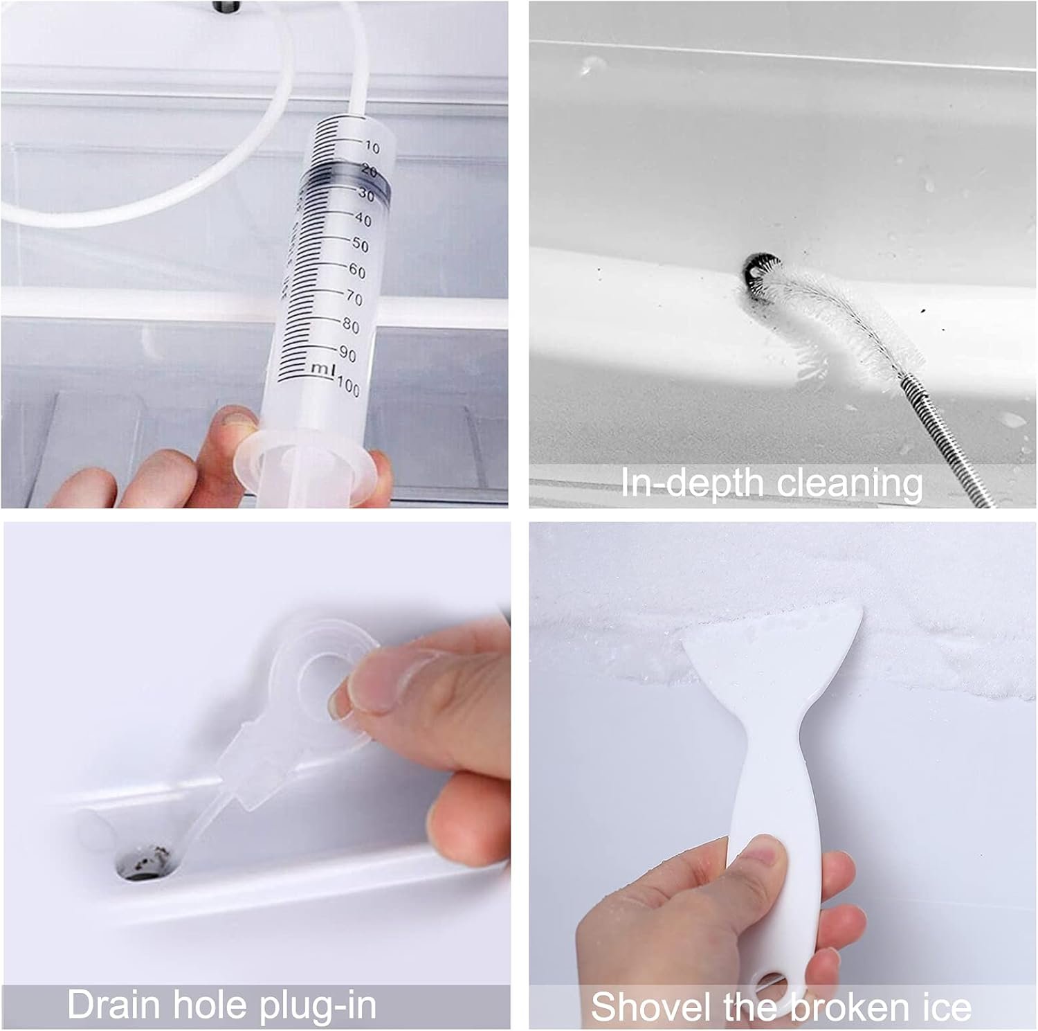 “Juego de 5 herramientas para el orificio de drenaje del refrigerador: incluye inyector de agua, tubo de dragado, varilla de inserción del orificio de drenaje, cepillo para orificio de drenaje, pala pequeña para hielo